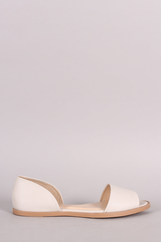 This stylish  flat  features a peep toe silhouette, open shanks, lightly padded insole, and easy slip on construction.