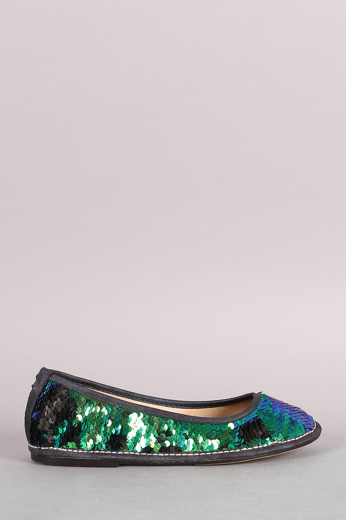 This eye-catching  ballet flat  features a round toe silhouette, hologram sequin upper with vegan leather trims, lightly padded insole, and easy slip-on construction.
