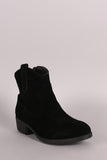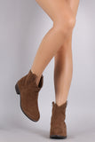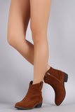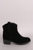 These western cowgirl ankle boots feature a round toe silhoutte, front stitch decorative pattern, side pull-on tab, and low stacked heel. Finished with cushioned insole and easy side on/off zipper closure.