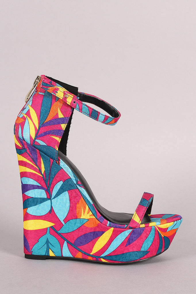 This delightful wedge features a tropical leaves print fabric upper, open toe silhouette, adjustable ankle strap with button accent, and back-zip closure. Finished with a lightly padded insole, wrapped platform, and wedge heel.