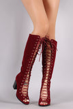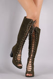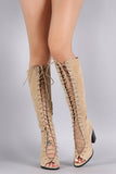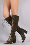 These stylish knee high boots feature an open toe silhouette, grommets with corset-style lace-up front, and chunky stacked heel. Finished with lightly cushioned insole and partial side zipper closure for easy on/off.