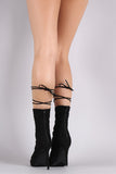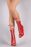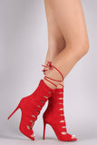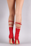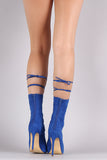 This heel features an open toe design, vegan suede straps with self-tie lace up design, open toe silhouette, and wrapped stiletto heel with a small platform. Finished with lightly padded insole and back-zip closure.
