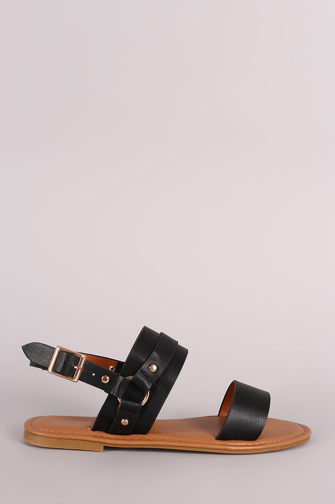 This lightweight flat sandal features an open toe silhouette, double band across vamp, decorative studded hardness straps design, and adjustable slingback strap with buckle closure. Finished with lightly padded insole for comfort.