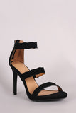 This gorgeous  heel  features an open toe silhouette, triple scalloped straps, and wrapped stiletto heel. Finished with lightly padded insole and rear zipper closure for easy on/off.