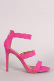This gorgeous  heel  features an open toe silhouette, triple scalloped straps, and wrapped stiletto heel. Finished with lightly padded insole and rear zipper closure for easy on/off.
