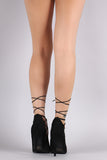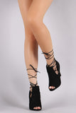 This gorgeous heeled bootie features a double side lace up cut out, long wrap around laces, peep toe silhouette, and wrapped stiletto heel. Finished with a lightly padded insole.