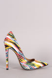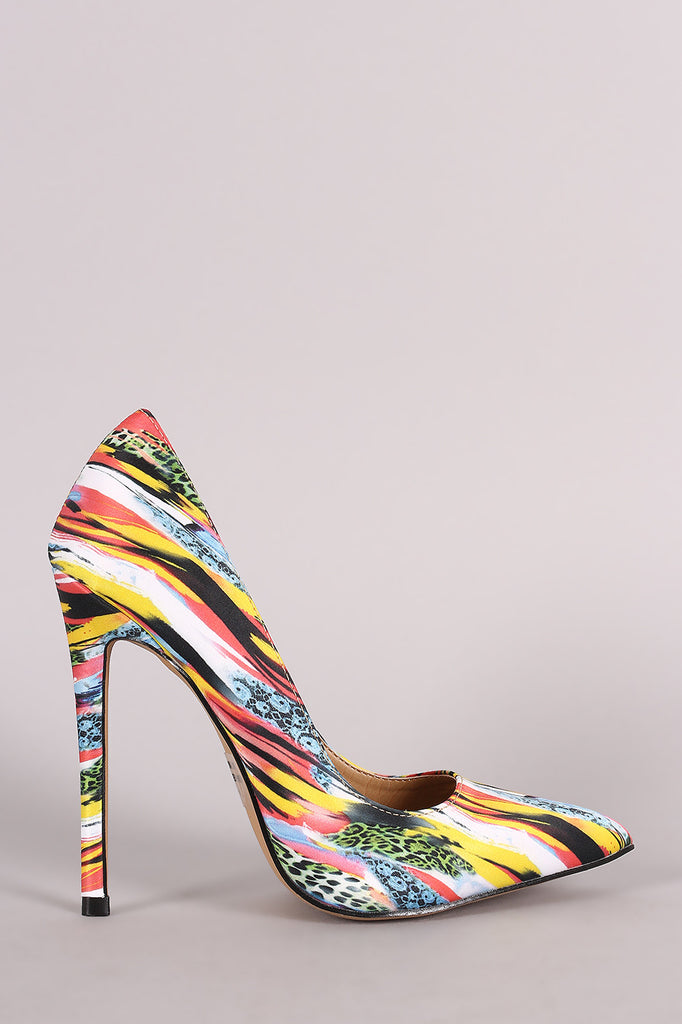 This  pointy toe  silhouette, scooped vamp, mixed print satin throughout, and wrapped stiletto heel. Finished with a lightly padded insole and easy slide style.