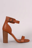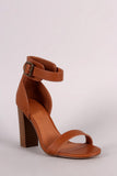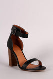 This sleek heel features a vegan leather upper, single band across vamp, open toe silhouette, and ankle cuff with side buckle closure. Finished with a lightly padded insole and chunky heel.