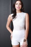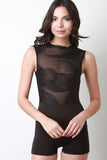 This combo romper features a semi-sheer texture mesh upper half, round neckline, sleeveless, zipper fastener at back, high waisted cinched seam, and a contrasting shorts bottom half. Accessories sold separately. Made in U.S.A. 100% Polyester.