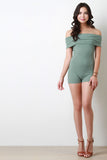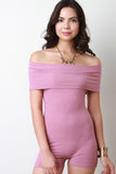 This chic sleeveless romper features a fold over off the shoulder design, and a rib knit fabrication. Accessories sold separately. Made in U.S.A. 60% Polyester 33% Rayon 7% Spandex.