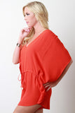 This romper features a v-neckline, self-tie bow at nape, short butterfly sleeves, drawstring waist with seashell charm, and flutter shorts. Accessories sold separately. 100% Rayon.