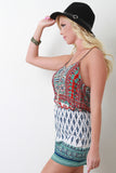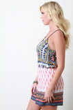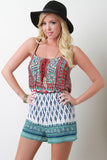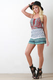 This sleeveless romper features a scoop neck, spaghetti straps, open deep v back, tie closure, elastic waist and a wide leg short. Accessories sold separately. 100% Rayon