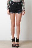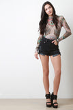 These denim shorts features a high waisted construction, distress front, fringed hemline, classic 5-pockets, belt loops, zipper fly, and a single button closure. Accessories sold separately. 100% Cotton.