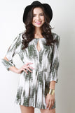This boho inspired romper features a tie dye woven fabrication , rounded neckline, gathering detail, elastic waist, three quarter sleeve with slits, loose fit short, finished with a back key hole with button at nape. Accessories sold separately. Made in U.S.A. 100% Rayon.