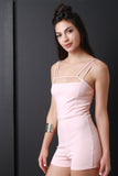 This cute romper features a square neckline, multi spaghetti strap design, princess seams, high waist seam, finished with an exposed back zipper closure. Accessories sold separately. Made in U.S.A. 67% Viscos, 28% Nylon, 5% Spandex.