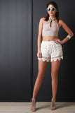 These cute shorts feature a high waist design, crochet lace fabrication, knit fabrication lining, with a wide elastic waistband, finished with a scalloped hem. Accessories sold separately. 98% Polyester, 2% Spandex.