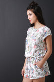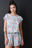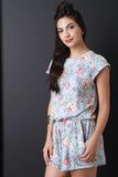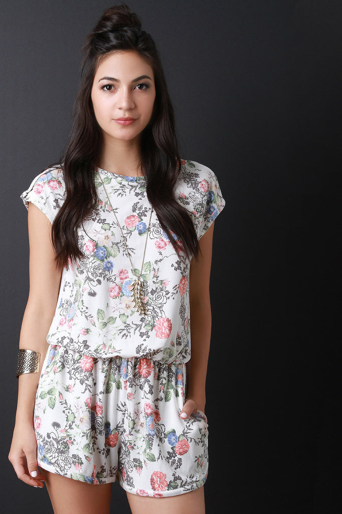 This lovely floral knit fabrication, cap sleeve with snap button closure at one side of the shoulder, cinched waistline, two slit pockets, back keyhole cutouts, and loose fit shorts. Accessories sold separately. Made in U.S.A. 62% Polyester, 33% Rayon, 5% Spandex.