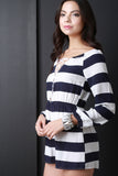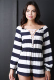 This nautical inspired romper features a wide stripe print, long sleeves, elastic armhole and neckline, elastic waist, finished with an elastic lace up front. Accessories sold separately. 100% Rayon.