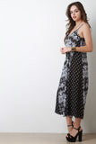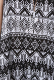 This jumpsuit features a v neck line, spaghetti straps, v shaped back, contrast side panels, loose flowy fit, and drop crotch design. Accessories sold separately. Made in U.S.A. 100% Rayon.