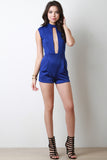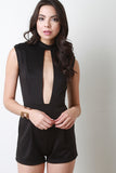 This alluring sleeveless romper features a mock neck, large keyhole cutout design at front, and padded wide shoulder construction. Finished with a front pleated waistline, short bottom half, and exposed back zipper closure. Accessories sold separately. Made in U.S.A. 96% Polyester, 4% Spandex.