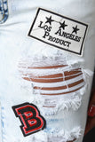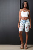 These Bermuda shorts feature a bleached wash, distressed detail, fun graphic patches, classic 5-pocket, belt loops, raw cuffed hem, finished with a zipper and single button closure. Accessories sold separately. 97% Cotton, 3% Spandex.