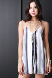 This chic romper features a challis fabrication, full lining, spaghetti straps, v neck line, low back, loose relaxed fit with wide cut shorts. Accessories sold separately. Made in U.S.A. 100% Rayon.