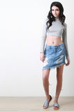 This medium wash denim skirt features belt loops, zipper fly to a single button closure and 5-pockets. Finished with ripped designs in the front, frayed and an asymmetrical hemline. Accessories sold separately. 100% Cotton.