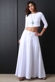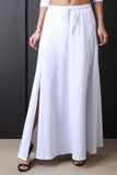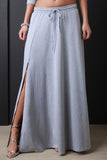 This skirt features a fitted waistband with cinched detail and a self tie drawstring. Finished with a jersey knit fabrication and maxi-length hemline. Accessories sold separately. 35% Cotton, 60% Polyester, 5% Spandex.