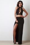 This skirt features a soft stretchy knit fabrication, and elasticized waistband. Finished with a side slit, and maxi length hemline. Accessories sold separately. Made in U.S.A. 95% Polyester, 5% Spandex.