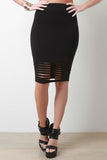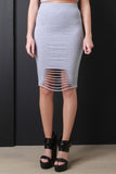 This casual midi skirt features a jersey knit fabrication, elasticized high waistline, figure-flattering silhouette, and finished with front distressed detail. Accessories sold separately. Made in U.S.A. 95% Cotton, 5% Spandex.