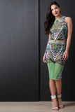 This bright skirt features a semi-sheer mesh fabrication with geometric tribal print, elasticized waist band, and midi-length hemline. Accessories sold separately. Made in U.S.A. 95% Polyester, 5% Spandex.