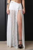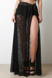 This skirt features a flowy sheer lace fabrication, high rise waistline with self tie band, and high vent slit detail. Finished with a maxi-length hemline. Accessories sold separately. Made in U.S.A. Self: 90% Nylon, 10% Spandex. Contrast: 95% Polyester, 5% Spandex.