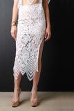 This skirt features a floral crochet lace fabrication with a solid nude underlay, high waist design, scalloped raw hemline, and a side slit. Accessories sold separately. Self: 100% Nylon, Lining: 100% Polyester.