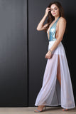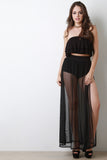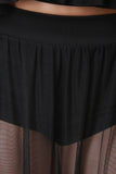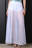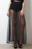 This maxi skirt features a semi-sheer overlay with left vent slit, high waisted design, and hot shorts underlay. Accessories sold separately. Made in U.S.A. 88% Polyester, 12% Spandex.