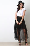 This beautiful maxi skirt features an asymmetrical layers of tulle overlay with a stretchy solid knit underlay and an back elastic waistband. Accessories sold separately. Outshell: 100% Polyester. Lining: 95% Rayon, 5% Spandex.