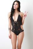 This beautiful crochet monokini features a triangle top to a self-tie halter, pattern knit, side cutout, brief bottom, and partially lined. Accessories sold separately. Made in U.S.A. 100% Cotton. Lining: 95% Rayon, 5% Spandex.