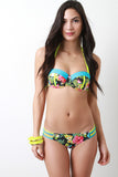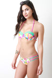 This bikini set features colorful tropical floral pattern print, color block panel accent, structure foam molded padding, underwire, self-tie caged back strap, and removable adjustable halter strap. Matching bikini bottom features low rise, cheeky bottom with strappy caged sides. Accessories sold separately. 82% Polyamid, 18% Elastan. Lining: 100% Polyester.