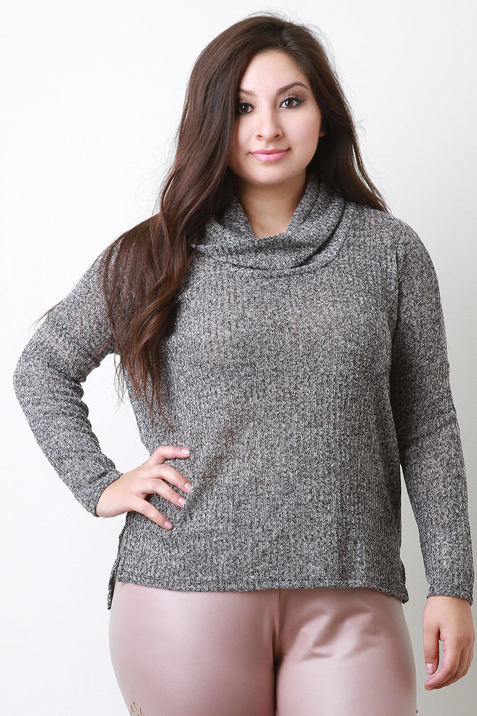 This plus size top features a marled knit fabrication, cowl neckline, long sleeves, double side slits, and high-low hemline. Accessories sold separately. Made in U.S.A. 47% Polyester, 47% Rayon, 6% Spandex.