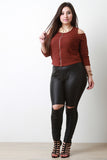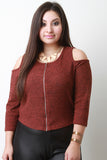 A short plus size top featuring marl ribbed knit, a round neckline with zip-up front, and three-quarters sleeves with cold shoulder cutouts. Accessories sold separately. Made in USA. 95% Polyester, 5% Spandex.