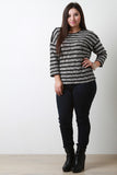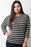 A plus size stripes , a round neckline, and three-quarters sleeves. The dropped shoulders are embellished with a faux placket and bezel buttons. Accessories sold separately. Made in USA. Self: 60% Cotton, 40% Spandex. Contrast: 82% Polyester, 14% Rayon, 4% Spandex.