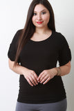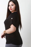 This plus size top features a round neckline, short roll tab sleeves with button accent, single chest pocket, and side cinched detail. Accessories sold separately. Made in U.S.A. 97% Rayon, 3% Spandex.