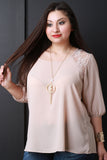 This lovely plus size blouse features a round neckline, floral lace trim at shoulder, three quarter sleeves, elasticized cuffs, and back keyhole cutout design with button closure. Blouse come with a long faux pearl pendant necklace with a curb chain tassel. Other accessories sold separately. Made in U.S.A. 100% Polyester. Contrast 92% Nylon, 8% Spandex.