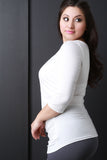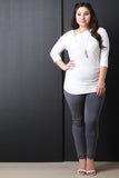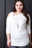 This jersey plus size top features a draping neckline, with right side open shoulder, and three quarter sleeves. Finished with a draping asymmetrical front and gathered design on left side. Accessories sold separately. Made in U.S.A. 95% Rayon, 5% Spandex.
