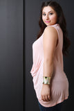This knit plus size top features a round neckline, sleeveless, with zipper accent on right side shoulder, and finished with a draping asymmetric front. Accessories sold separately. Made in U.S.A. 98% Rayon, 2% Spandex.