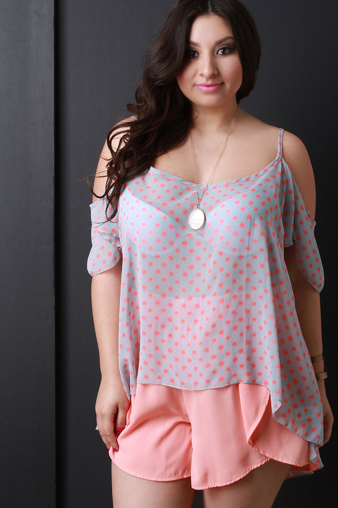 A plus size top featuring flowy spotted chiffon, a cold shoulder design with thin shoulder straps, and a slanted high-low hemline. Accessories sold separately. Made in U.S.A. 100% Polyester.