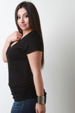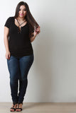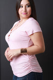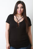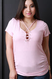 This plus size top features a grommets with corset style lace up design, short sleeves, and side cinched detail. Accessories sold separately. Made in U.S.A. 97% Rayon, 3% Spandex.