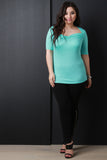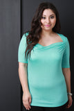 This plus size top features a jersey knit fabrication, draped square neckline, short sleeves, and ruched detail at nape. Accessories sold separately. Made in U.S.A. 65% Rayon, 5% Spandex.