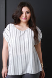 This plus size blouse top features a lightweight texture with vertical stripe fabrication and a round neckline. Finished with short sleeves with a button accent and a keyhole cutout in the back. Accessories sold separately. Made in U.S.A. 100% Polyester.