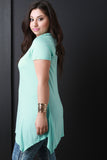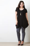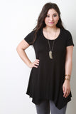 This plus size top features soft jersey knit, scoop neckline, short sleeves, relaxed fit, and handkerchief hemline. Accessories sold separately. Made in U.S.A. 96% Viscose, 4% Spandex.