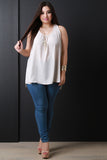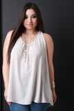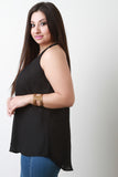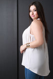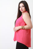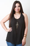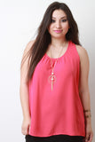 This plus size chiffon top features a pleated scoop neckline, sleeveless design, and high-low curved hemline. Accessories sold separately. Made in U.S.A. Top come with a faux pearl pendant necklace. Other accessories sold separately. Made in U.S.A. 100% Polyester.